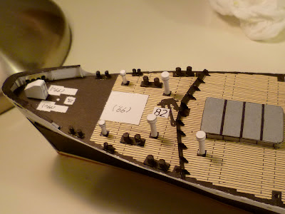 本体に接着します。甲板に明けておいた穴は、必ずしも十分な直径がない場合もあります。そのときは尖ったドライバなどで穴の大きさを調整してから差込みます。また甲板に垂直に立てるのではなく、水平面に対して垂直になるように気をつけます。